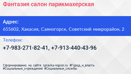Фантазия, салон-парикмахерская по адресу 655602, Хакасия, Саяногорск, Советский микрорайон, 2 в дальнейшем Организация, размещена в следующих категориях: