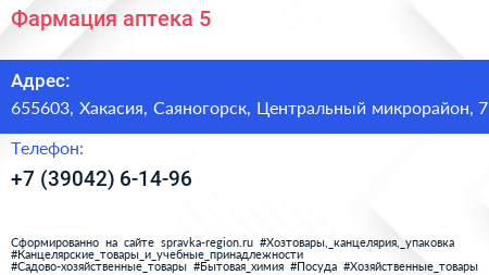 Фармация-аптека №5 по адресу 655603, Хакасия, Саяногорск, Центральный микрорайон, 7 в дальнейшем Организация, размещена в следующих категориях: