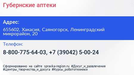 Губернские аптеки по адресу 655602, Хакасия, Саяногорск, Ленинградский микрорайон, 20 в дальнейшем Организация, размещена в следующих категориях: