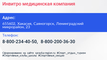 Инвитро, медицинская компания по адресу 655602, Хакасия, Саяногорск, Ленинградский микрорайон, 23 в дальнейшем Организация, размещена в следующих категориях:
