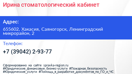 Ирина, стоматологический кабинет по адресу 655602, Хакасия, Саяногорск, Ленинградский микрорайон, 2 в дальнейшем Организация, размещена в следующих категориях:
