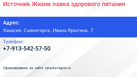 Источник Жизни, лавка здорового питания по адресу Хакасия, Саяногорск, Ивана Ярыгина, 7 в дальнейшем Организация, размещена в следующих категориях: