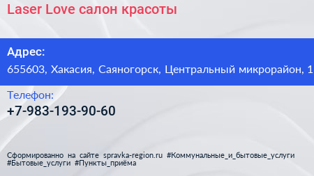 Laser Love, салон красоты по адресу 655603, Хакасия, Саяногорск, Центральный микрорайон, 1 в дальнейшем Организация, размещена в следующих категориях: