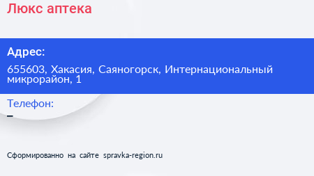 Люкс, аптека по адресу 655603, Хакасия, Саяногорск, Интернациональный микрорайон, 1 в дальнейшем Организация, размещена в следующих категориях:
