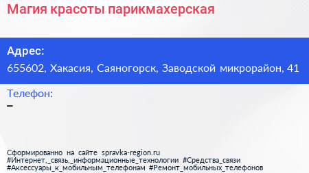 Магия красоты, парикмахерская по адресу 655602, Хакасия, Саяногорск, Заводской микрорайон, 41 в дальнейшем Организация, размещена в следующих категориях:
