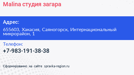 Malina, студия загара по адресу 655603, Хакасия, Саяногорск, Интернациональный микрорайон, 1 в дальнейшем Организация, размещена в следующих категориях: