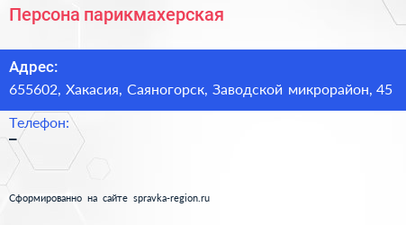 Персона, парикмахерская по адресу 655602, Хакасия, Саяногорск, Заводской микрорайон, 45 в дальнейшем Организация, размещена в следующих категориях: