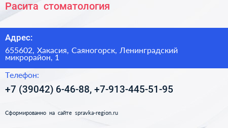 Расита+, стоматология по адресу 655602, Хакасия, Саяногорск, Ленинградский микрорайон, 1 в дальнейшем Организация, размещена в следующих категориях: