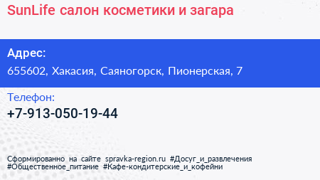 SunLife, салон косметики и загара по адресу 655602, Хакасия, Саяногорск, Пионерская, 7 в дальнейшем Организация, размещена в следующих категориях: