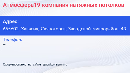 Атмосфера19, компания натяжных потолков по адресу 655602, Хакасия, Саяногорск, Заводской микрорайон, 43 в дальнейшем Организация, размещена в следующих категориях: