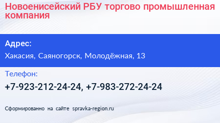 Новоенисейский РБУ, торгово-промышленная компания по адресу Хакасия, Саяногорск, Молодёжная, 13 в дальнейшем Организация, размещена в следующих категориях: