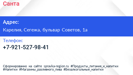 Санта по адресу Карелия, Сегежа, бульвар Советов, 1а в дальнейшем Организация, размещена в следующих категориях: