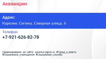 Аквамарин по адресу Карелия, Сегежа, Северная улица, 6 в дальнейшем Организация, размещена в следующих категориях: