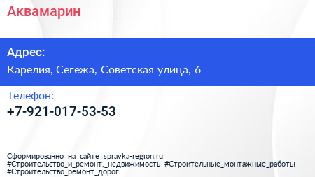 Аквамарин по адресу Карелия, Сегежа, Советская улица, 6 в дальнейшем Организация, размещена в следующих категориях: