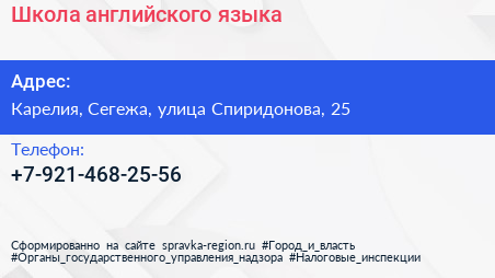 Школа английского языка по адресу Карелия, Сегежа, улица Спиридонова, 25 в дальнейшем Организация, размещена в следующих категориях: