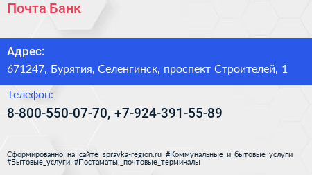 Почта Банк по адресу 671247, Бурятия, Селенгинск, проспект Строителей, 1 в дальнейшем Организация, размещена в следующих категориях: