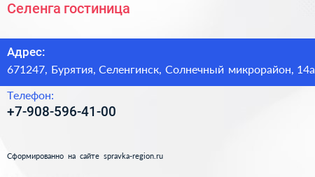 Селенга, гостиница по адресу 671247, Бурятия, Селенгинск, Солнечный микрорайон, 14а в дальнейшем Организация, размещена в следующих категориях: