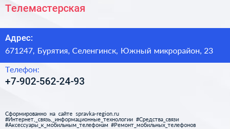 Телемастерская по адресу 671247, Бурятия, Селенгинск, Южный микрорайон, 23 в дальнейшем Организация, размещена в следующих категориях: