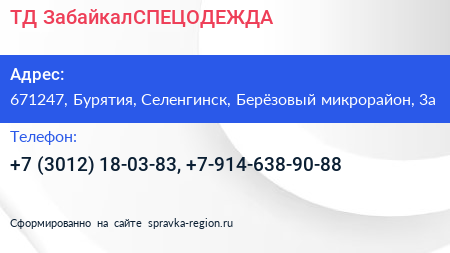 ТД ЗабайкалСПЕЦОДЕЖДА по адресу 671247, Бурятия, Селенгинск, Берёзовый микрорайон, 3а в дальнейшем Организация, размещена в следующих категориях: