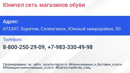Юничел, сеть магазинов обуви по адресу 671247, Бурятия, Селенгинск, Южный микрорайон, 50 в дальнейшем Организация, размещена в следующих категориях: