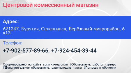 Центровой, комиссионный магазин по адресу 671247, Бурятия, Селенгинск, Берёзовый микрорайон, 6 к13 в дальнейшем Организация, размещена в следующих категориях: