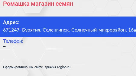 Ромашка, магазин семян по адресу 671247, Бурятия, Селенгинск, Солнечный микрорайон, 16а в дальнейшем Организация, размещена в следующих категориях: