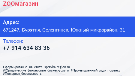 ZOOмагазин по адресу 671247, Бурятия, Селенгинск, Южный микрорайон, 31 в дальнейшем Организация, размещена в следующих категориях:
