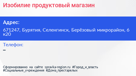 Изобилие, продуктовый магазин по адресу 671247, Бурятия, Селенгинск, Берёзовый микрорайон, 6 к20 в дальнейшем Организация, размещена в следующих категориях: