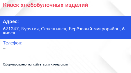 Киоск хлебобулочных изделий по адресу 671247, Бурятия, Селенгинск, Берёзовый микрорайон, 6 киоск в дальнейшем Организация, размещена в следующих категориях: