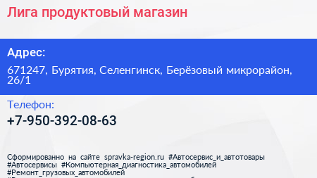 Лига, продуктовый магазин по адресу 671247, Бурятия, Селенгинск, Берёзовый микрорайон, 26/1 в дальнейшем Организация, размещена в следующих категориях: