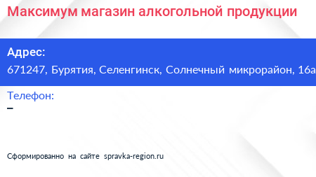 Максимум, магазин алкогольной продукции по адресу 671247, Бурятия, Селенгинск, Солнечный микрорайон, 16а в дальнейшем Организация, размещена в следующих категориях: