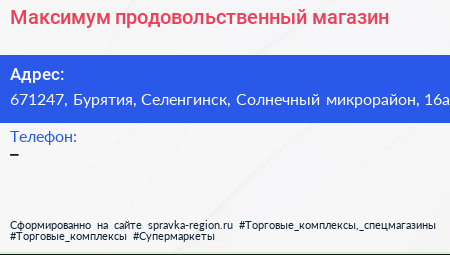 Максимум, продовольственный магазин по адресу 671247, Бурятия, Селенгинск, Солнечный микрорайон, 16а в дальнейшем Организация, размещена в следующих категориях: