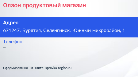Олзон, продуктовый магазин по адресу 671247, Бурятия, Селенгинск, Южный микрорайон, 1 в дальнейшем Организация, размещена в следующих категориях: