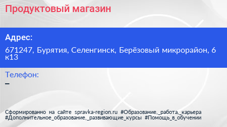 Продуктовый магазин по адресу 671247, Бурятия, Селенгинск, Берёзовый микрорайон, 6 к13 в дальнейшем Организация, размещена в следующих категориях: