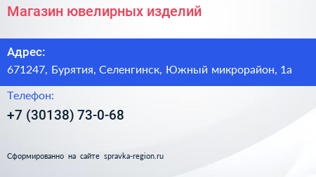 Магазин ювелирных изделий по адресу 671247, Бурятия, Селенгинск, Южный микрорайон, 1а в дальнейшем Организация, размещена в следующих категориях: