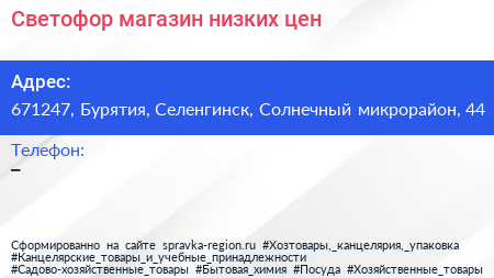 Светофор, магазин низких цен по адресу 671247, Бурятия, Селенгинск, Солнечный микрорайон, 44 в дальнейшем Организация, размещена в следующих категориях: