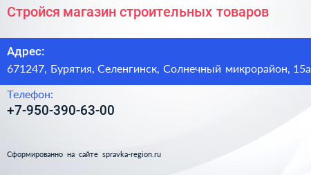Стройся, магазин строительных товаров по адресу 671247, Бурятия, Селенгинск, Солнечный микрорайон, 15а в дальнейшем Организация, размещена в следующих категориях: