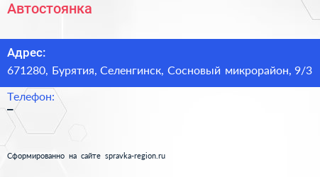 Автостоянка по адресу 671280, Бурятия, Селенгинск, Сосновый микрорайон, 9/3 в дальнейшем Организация, размещена в следующих категориях: