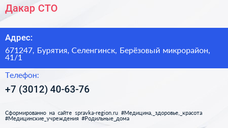 Дакар, СТО по адресу 671247, Бурятия, Селенгинск, Берёзовый микрорайон, 41/1 в дальнейшем Организация, размещена в следующих категориях: