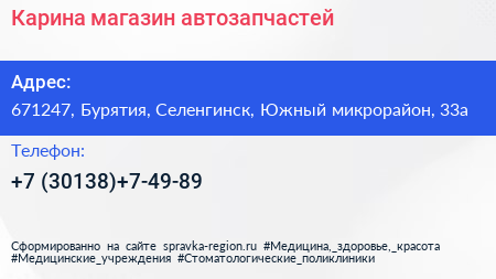 Карина, магазин автозапчастей по адресу 671247, Бурятия, Селенгинск, Южный микрорайон, 33а в дальнейшем Организация, размещена в следующих категориях: