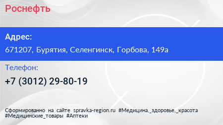 Роснефть по адресу 671207, Бурятия, Селенгинск, Горбова, 149а в дальнейшем Организация, размещена в следующих категориях: