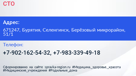 СТО по адресу 671247, Бурятия, Селенгинск, Берёзовый микрорайон, 51/1 в дальнейшем Организация, размещена в следующих категориях:
