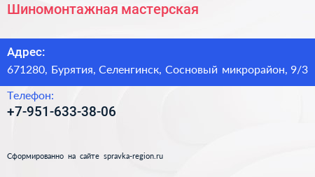 Шиномонтажная мастерская по адресу 671280, Бурятия, Селенгинск, Сосновый микрорайон, 9/3 в дальнейшем Организация, размещена в следующих категориях: