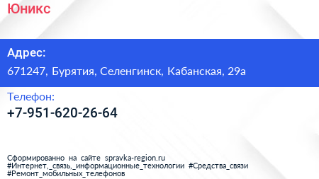 Юникс по адресу 671247, Бурятия, Селенгинск, Кабанская, 29а в дальнейшем Организация, размещена в следующих категориях: