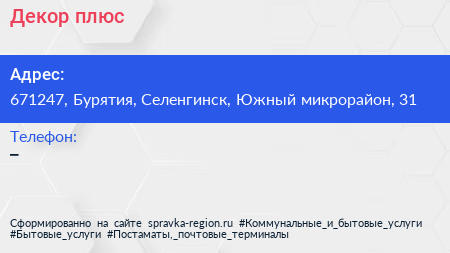 Декор плюс по адресу 671247, Бурятия, Селенгинск, Южный микрорайон, 31 в дальнейшем Организация, размещена в следующих категориях: