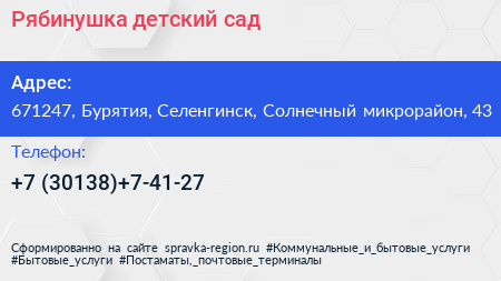 Рябинушка, детский сад по адресу 671247, Бурятия, Селенгинск, Солнечный микрорайон, 43 в дальнейшем Организация, размещена в следующих категориях: