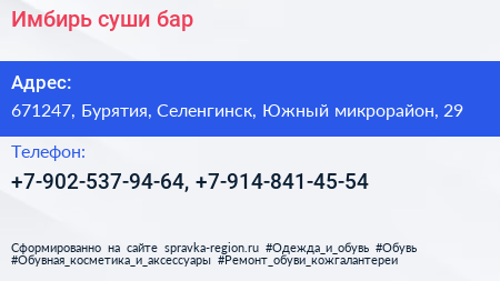Имбирь, суши-бар по адресу 671247, Бурятия, Селенгинск, Южный микрорайон, 29 в дальнейшем Организация, размещена в следующих категориях: