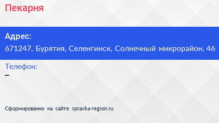 Пекарня по адресу 671247, Бурятия, Селенгинск, Солнечный микрорайон, 46 в дальнейшем Организация, размещена в следующих категориях: