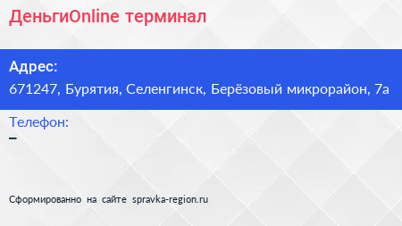 ДеньгиOnline, терминал по адресу 671247, Бурятия, Селенгинск, Берёзовый микрорайон, 7а в дальнейшем Организация, размещена в следующих категориях: