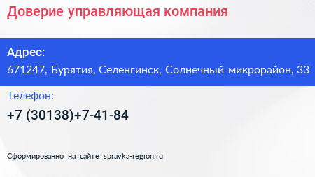Доверие, управляющая компания по адресу 671247, Бурятия, Селенгинск, Солнечный микрорайон, 33 в дальнейшем Организация, размещена в следующих категориях: